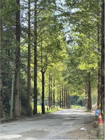 “这条路是通向岔口革命老区和小川、武阳、新溪口、昌溪等旅游区域的一条主要道路,原来的道路狭窄且路面破损严重,安全隐患不小。”这条路段全场1.8公里,看似不长,确实一条关键的“毛细血管”,是深渡镇村民日常出行的“生命线”。2024年,相关部门走访调研,现状道路迂回曲折,存在多个小半径回头曲线与大纵坡组合,路线指标差,西侧基本农田分布广泛,存在较大安全隐患。但两侧的水杉风景线为周边环境增添了一抹别样的自然魅力。当地村民及调研团队都提到要保护好两侧的水杉风景带。